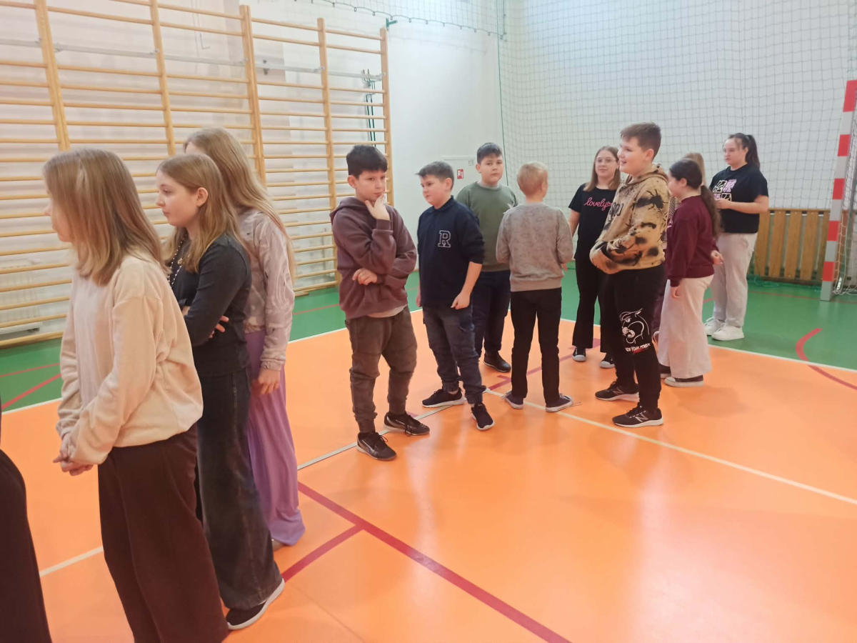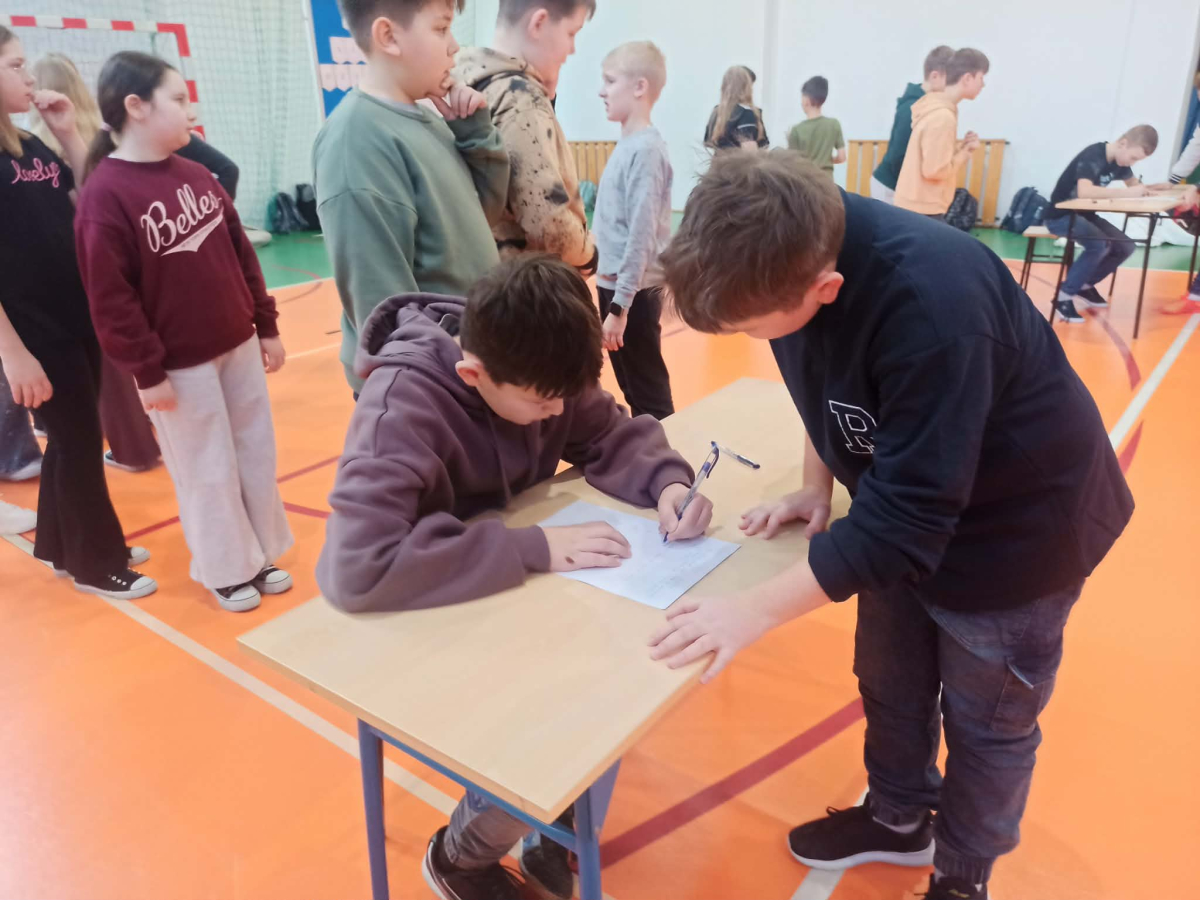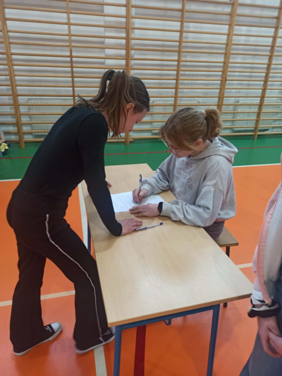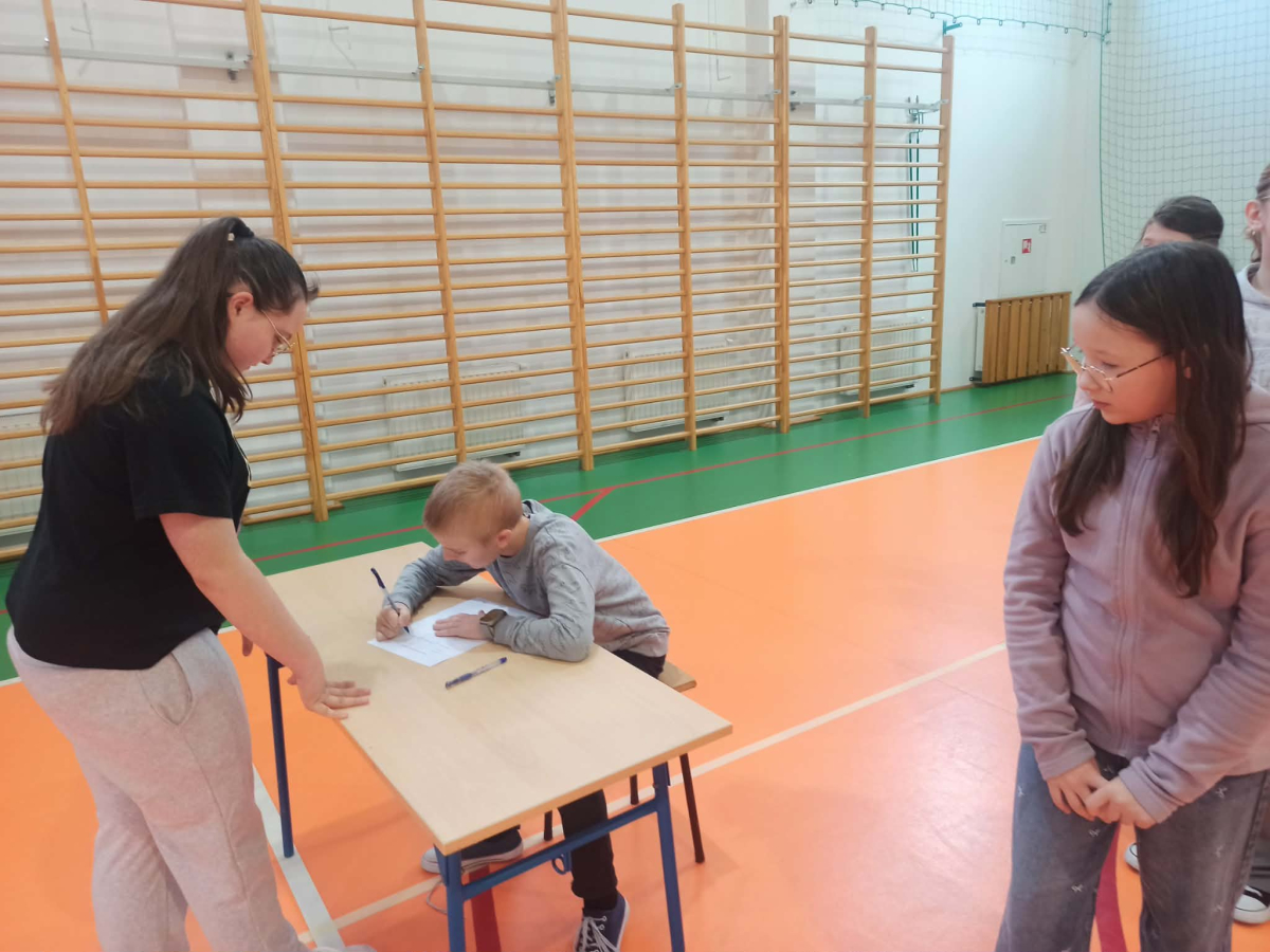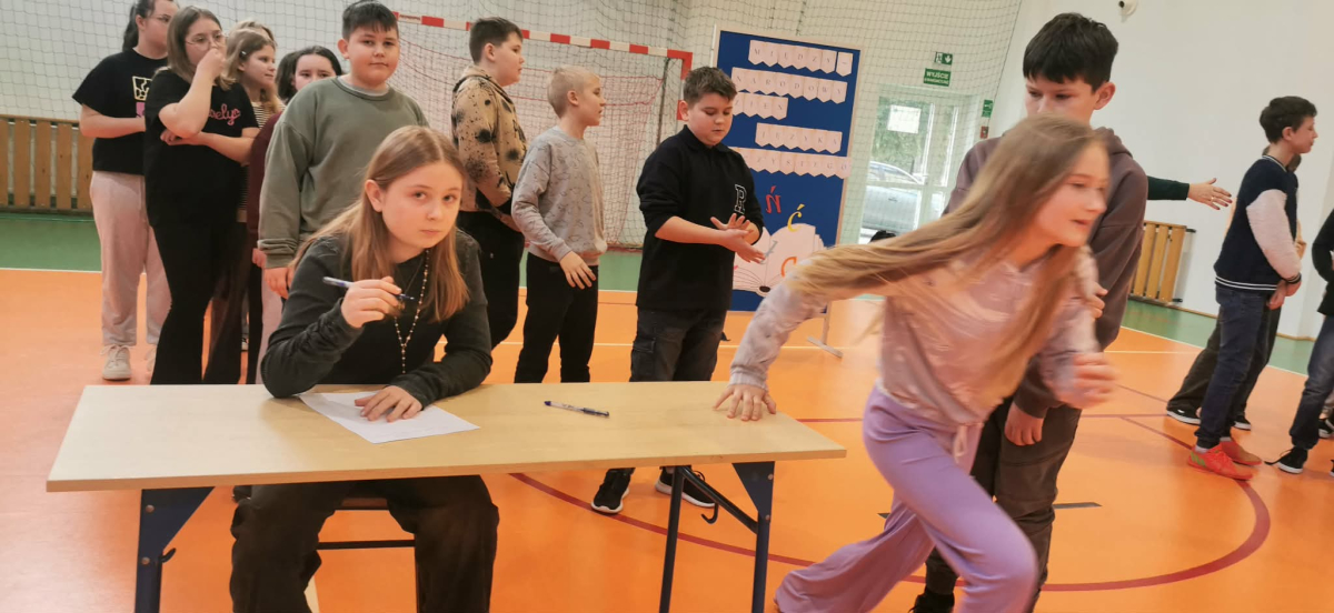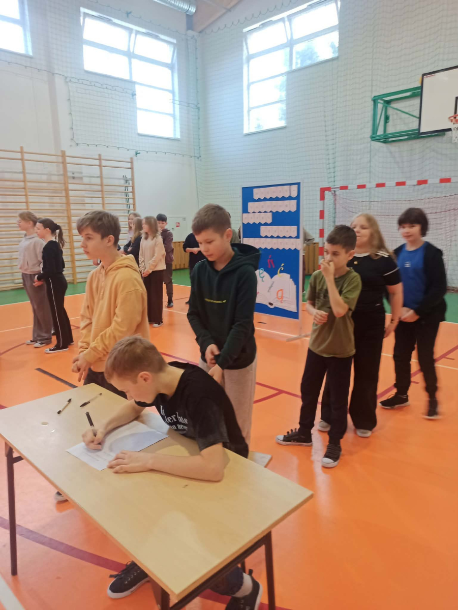 Z okazji przypadającego na czas ferii Międzynarodowego Dnia Języka Ojczystego Panie: Ewelina Mucha, Lucyna Woźny, Anna Kwiatek zorganizowały akcję pt. „Biegane dyktando”, skierowaną do uczniów klas III–VIII. Celem wydarzenia było promowanie poprawnej polszczyzny, rozwijanie umiejętności ortograficznych oraz połączenie nauki z aktywnością ruchową i dobrą zabawą.