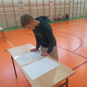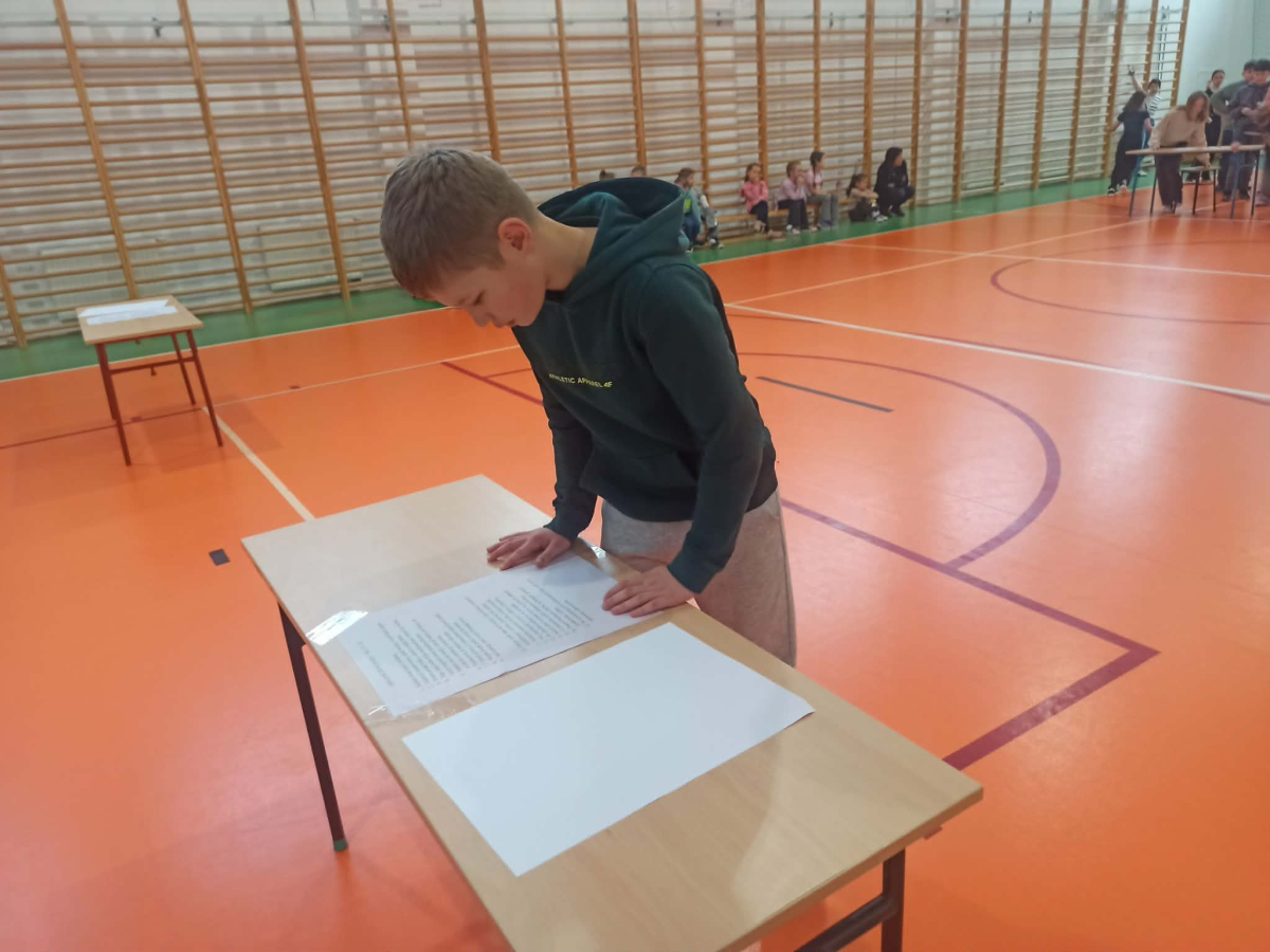 w jednym miejscu umieszczono tekst dyktanda, a w innym czystą kartkę. Uczestnicy, podzieleni na grupy: gr. I: kl. III –IV,