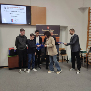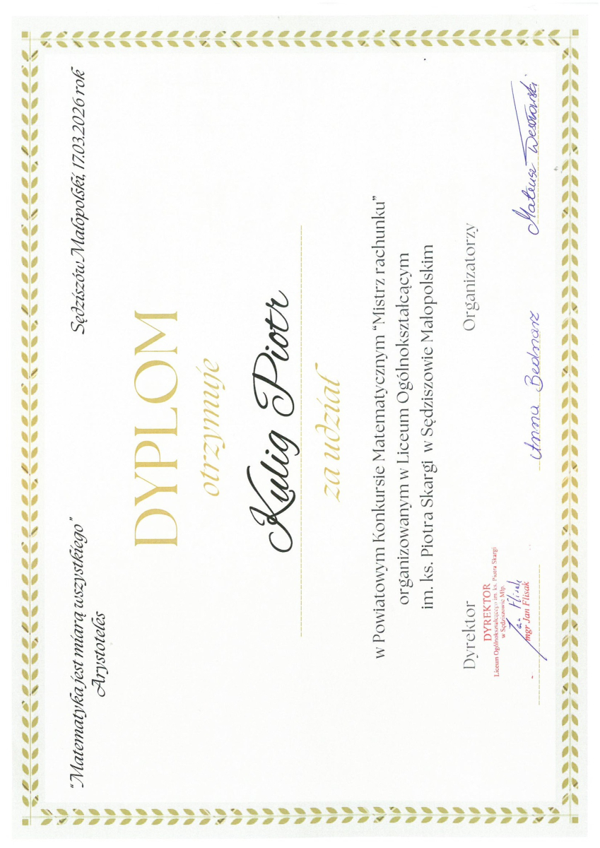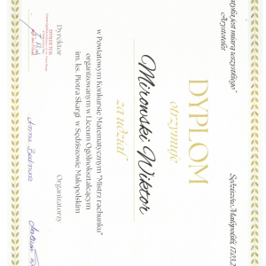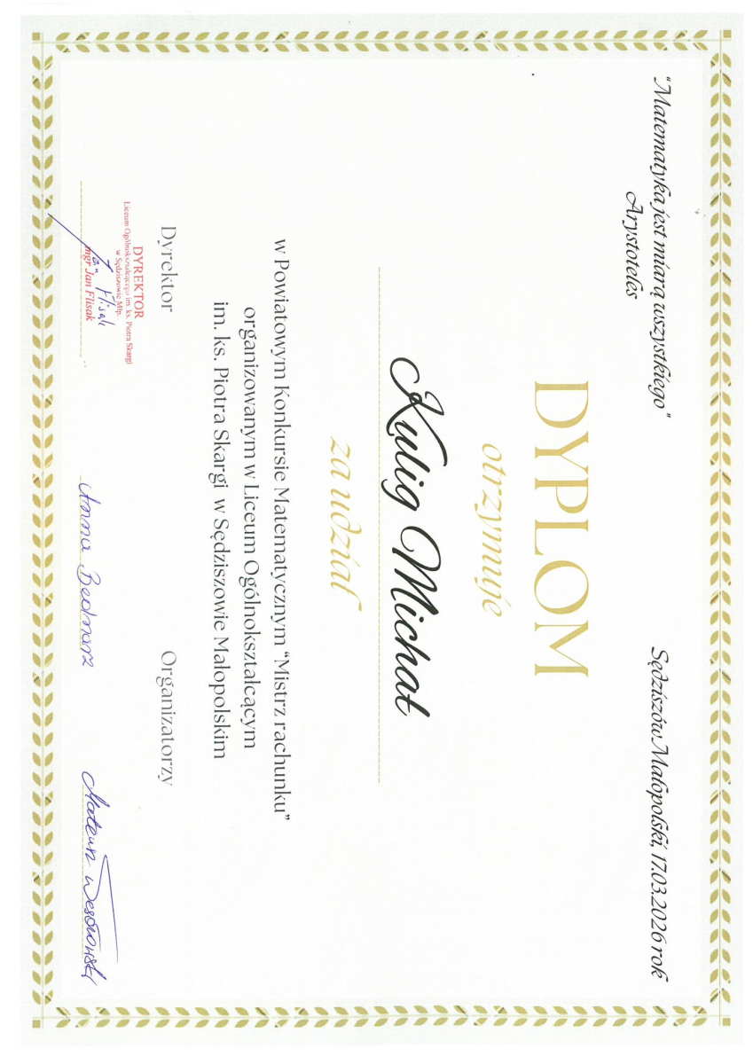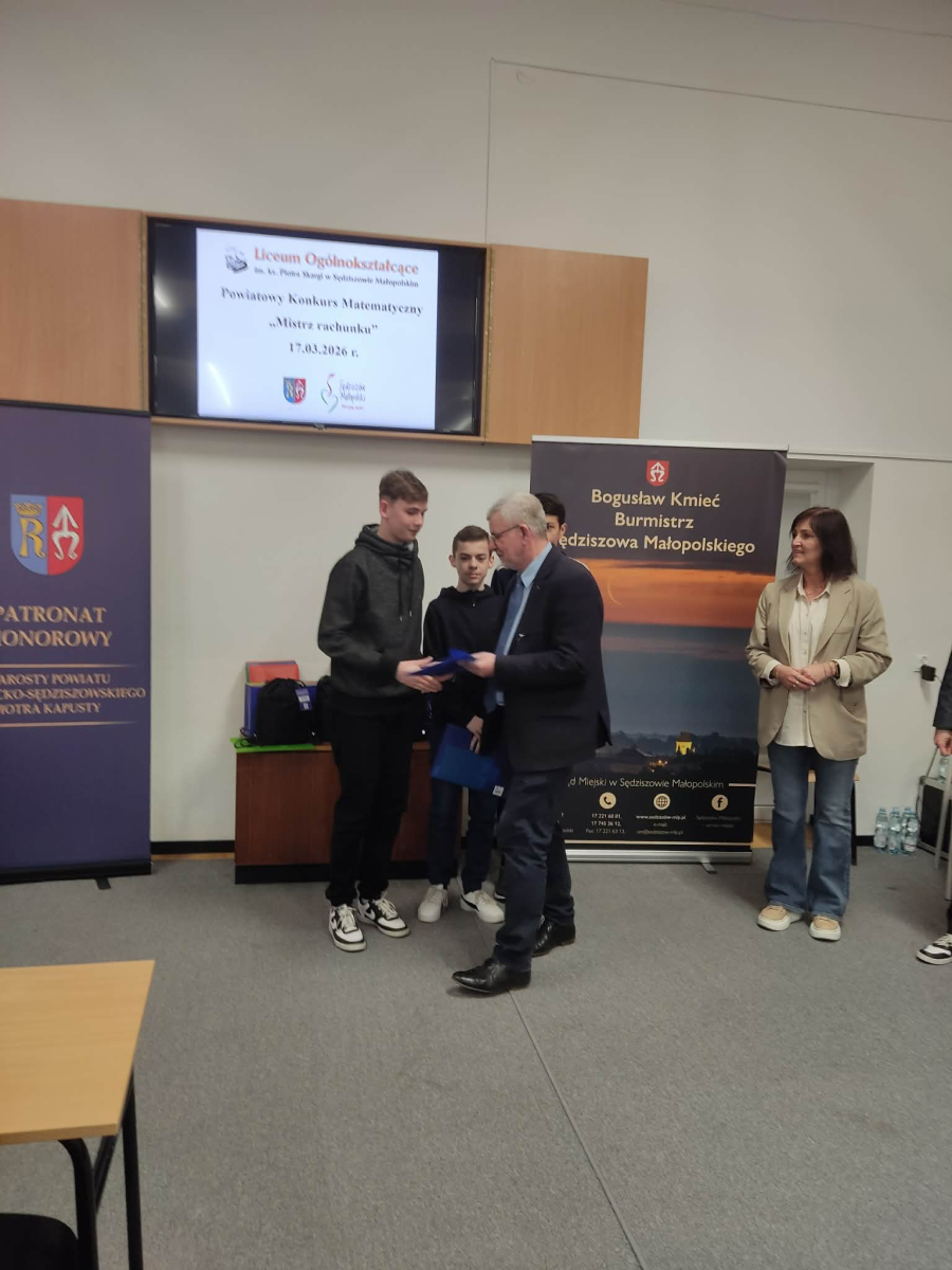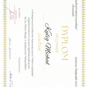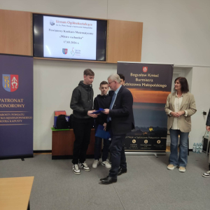 Uczniowie klasy ósmej naszej szkoły wzięli udział w Powiatowym Konkursie Matematycznym „Mistrz rachunku”. Szkołę reprezentowali: Michał Kulig, Piotr Kulig oraz Wiktor Mirowski.