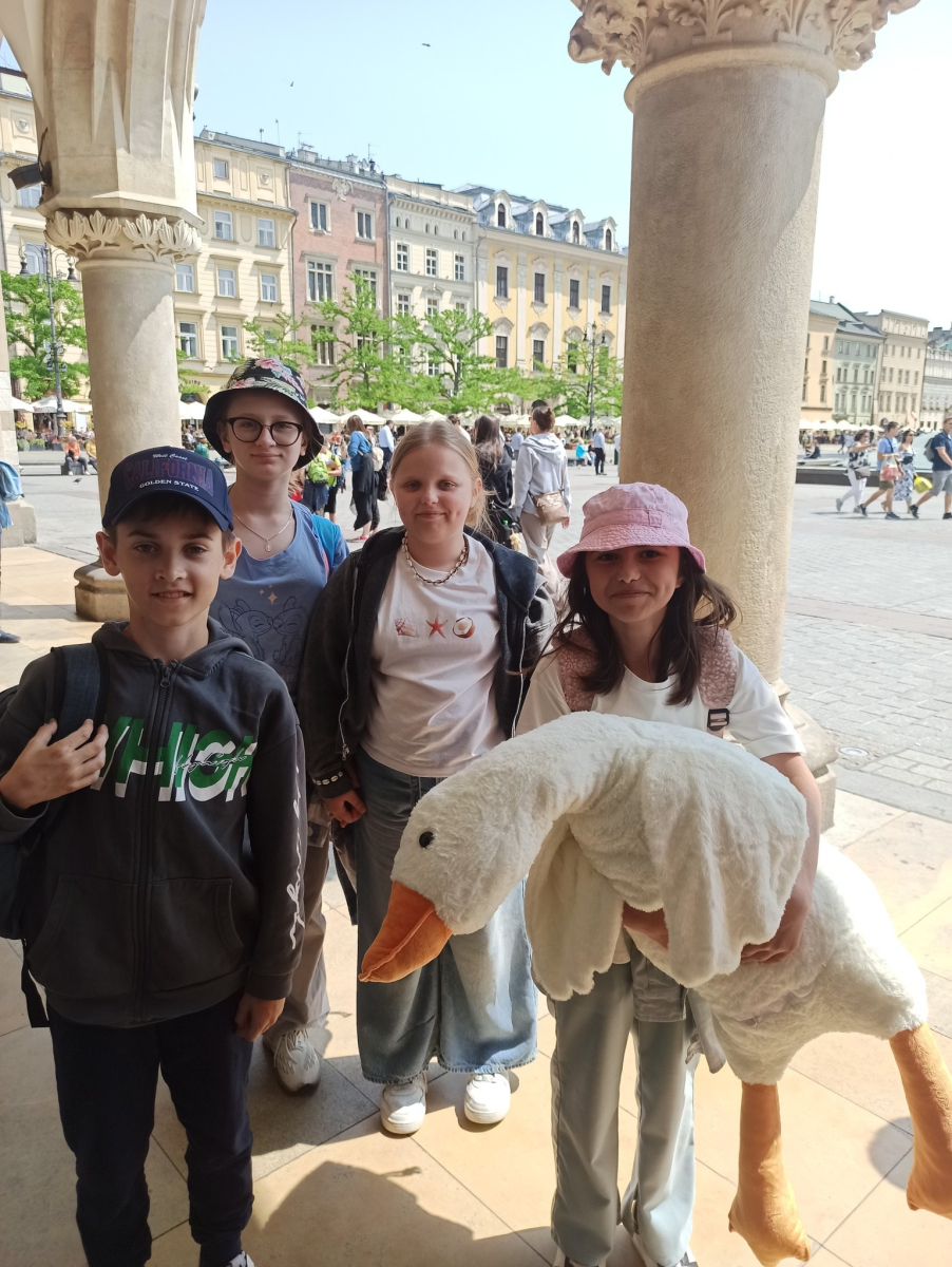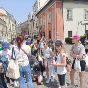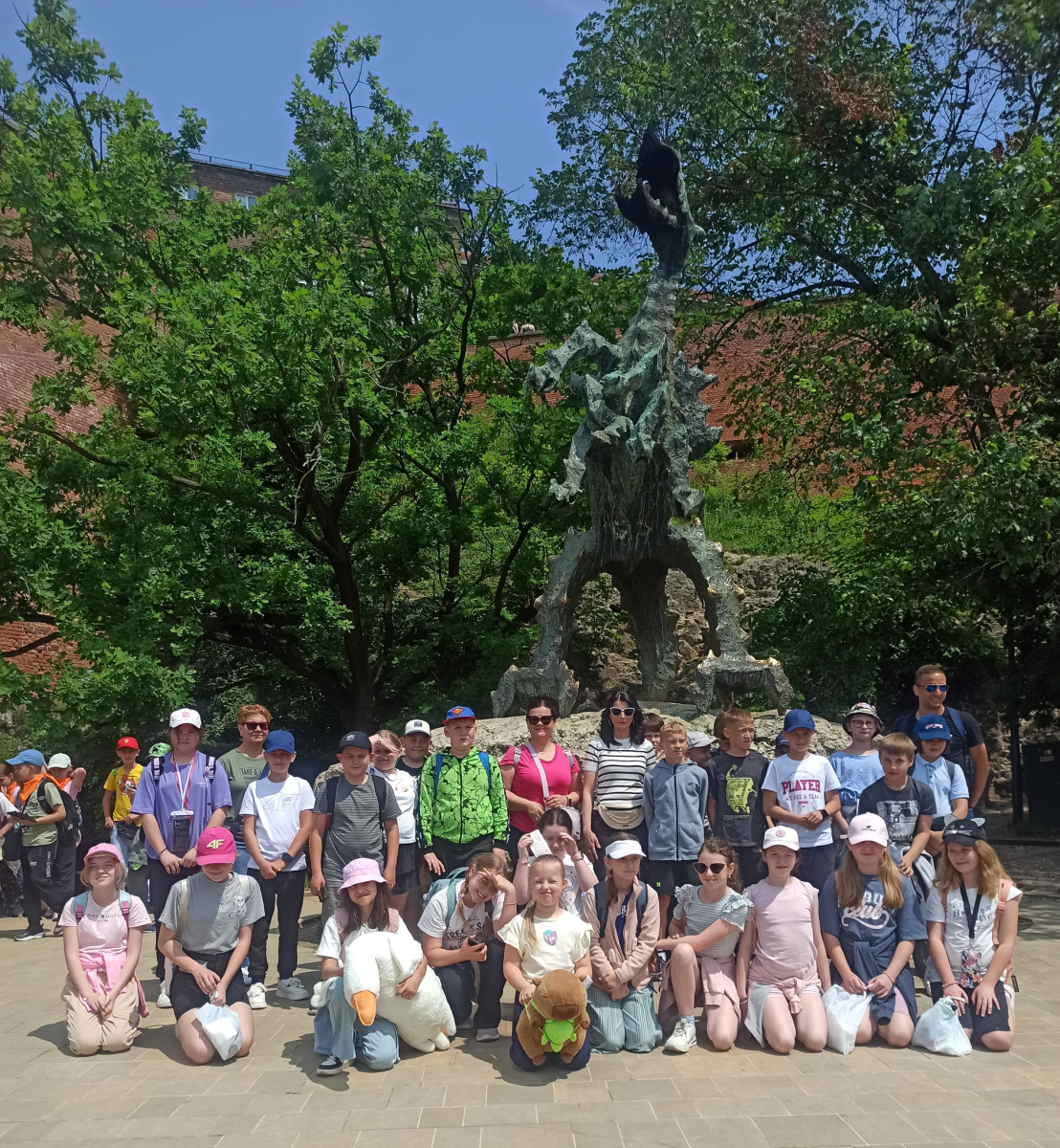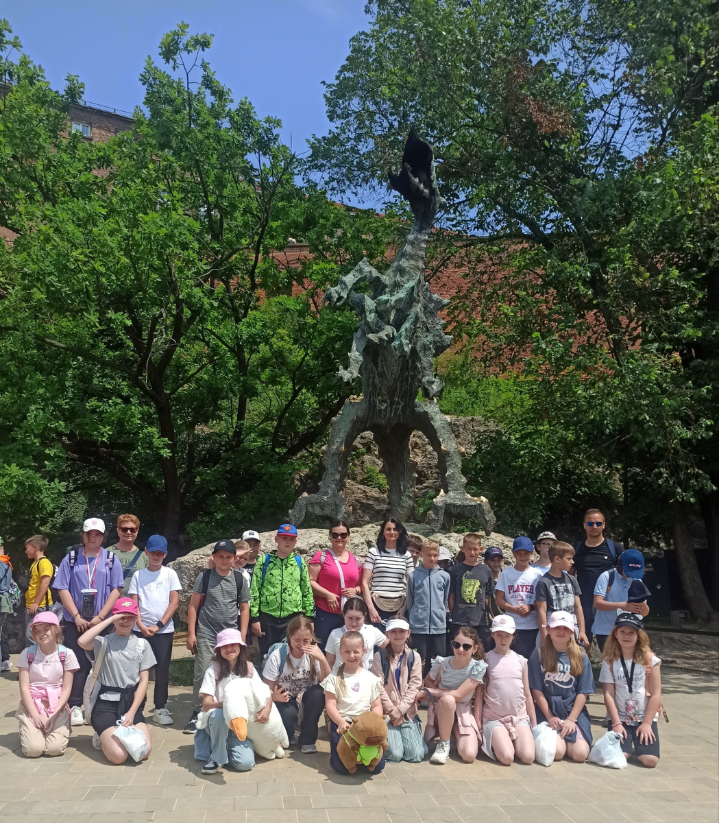 Uczniowie wzięli udział w programie ,,Średniowieczny Kraków ". Wraz z Panią przewodnik Katarzyną Garus przemierzyliśmy Drogę Królewską, od Barbakanu przez Rynek Główny, Sukiennice, kościół Mariacki, Wzgórze Wawelskie do Smoczej Jamy. Atrakcją programu były inscenizowane legendy o hejnale mariackim, ,,bitwa" na piankowe miecze oraz spotkanie ze smokiem wawelskim. Zwiedziliśmy również Ogród Zoologiczny w Krakowie, w którym mogliśmy podziwiać wiele gatunków egzotycznych zwierząt.
