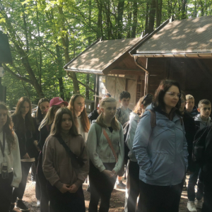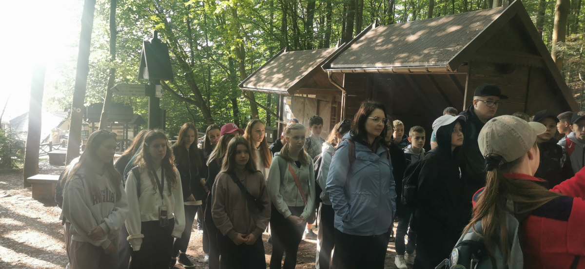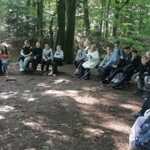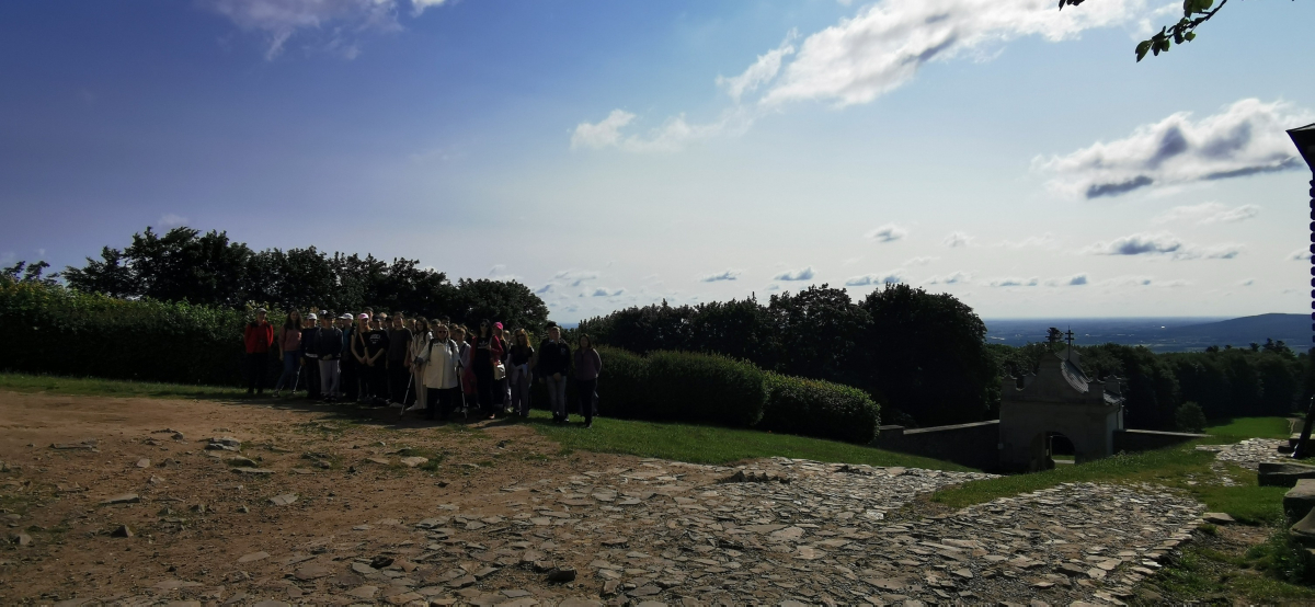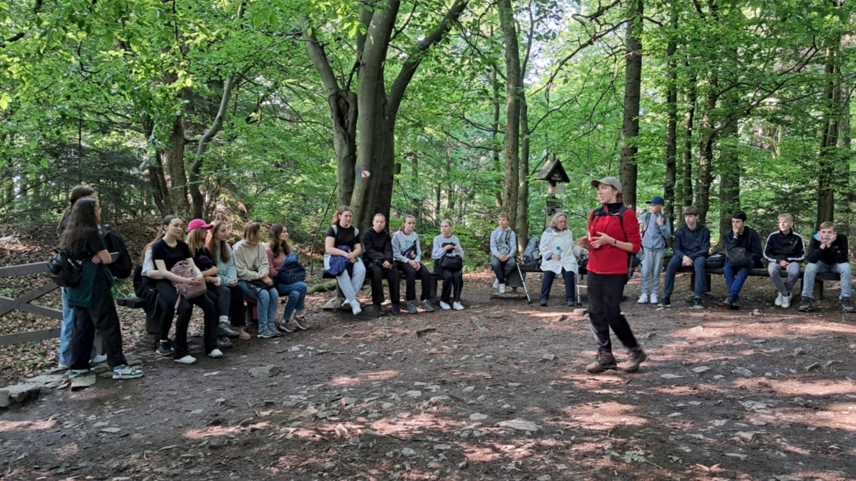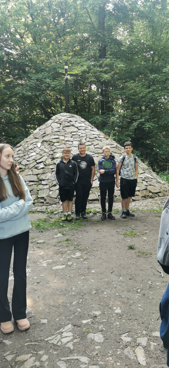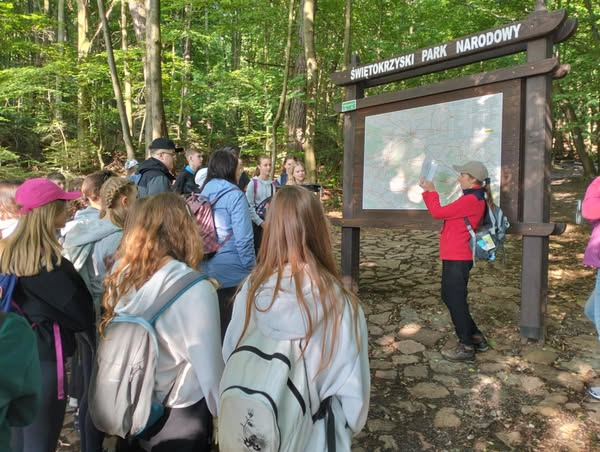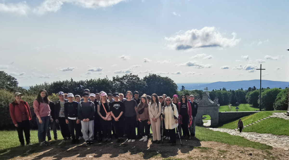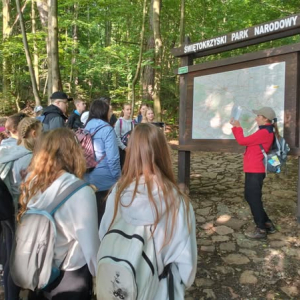 Pierwszym punktem programu było wejście niebieskim szlakiem z Nowej Słupi na Święty Krzyż. Trasa była wymagająca, ale uczniowie poradzili sobie świetnie, podziwiając po drodze piękno przyrody i malownicze krajobrazy Gór Świętokrzyskich oraz słuchając przewodniczki.
