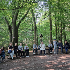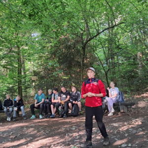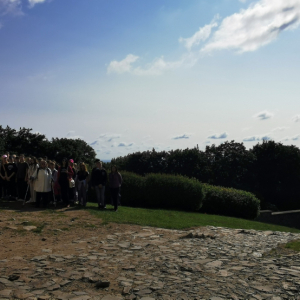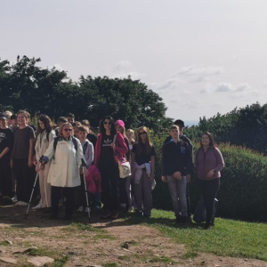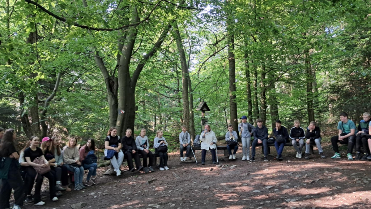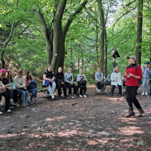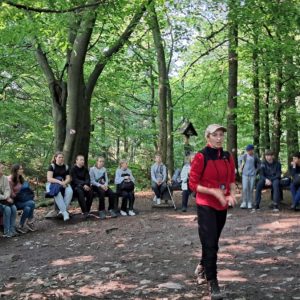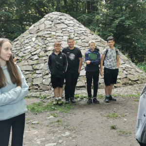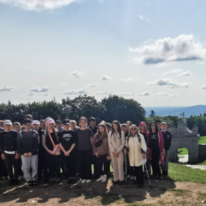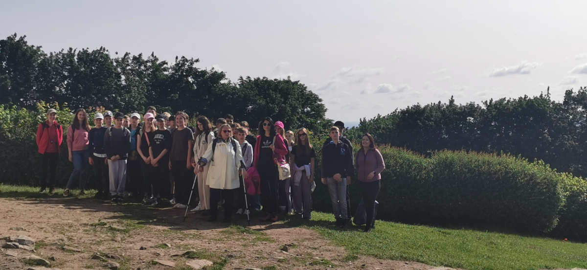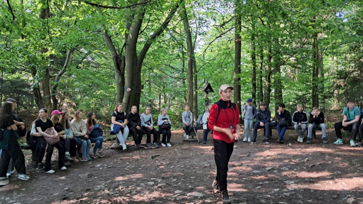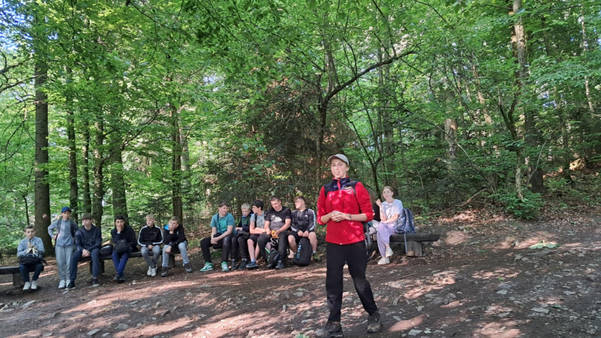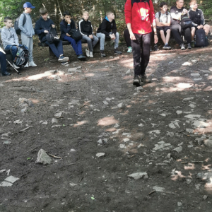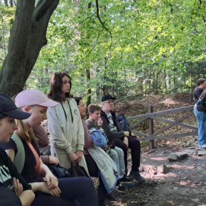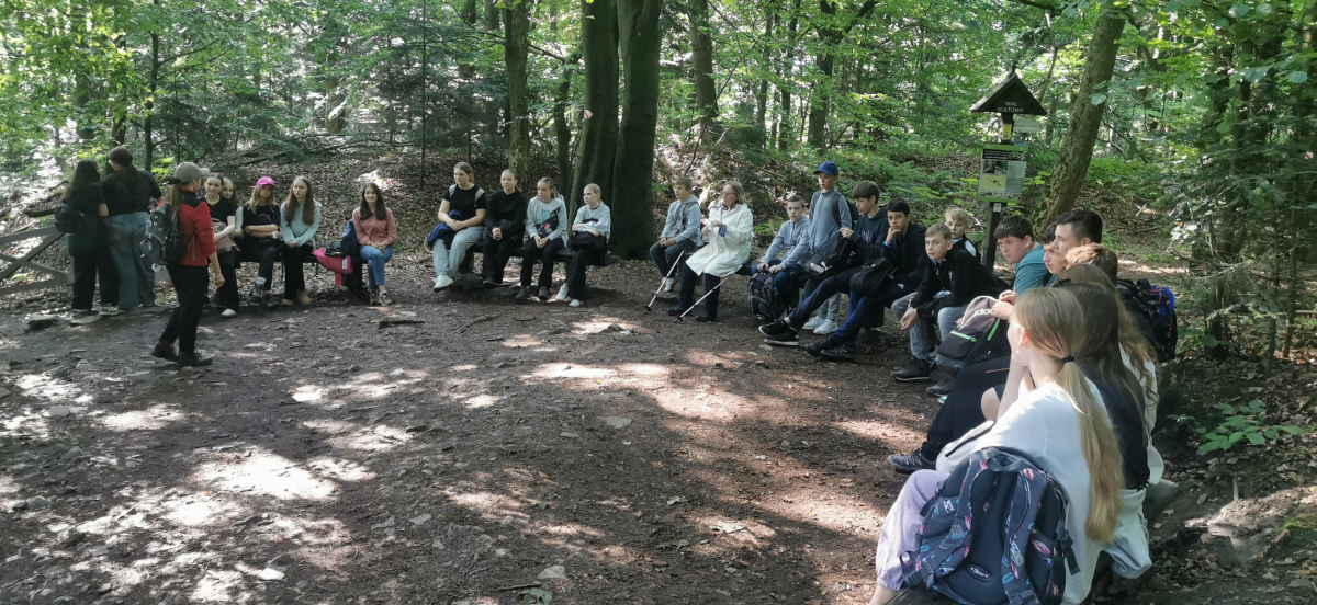 Pierwszym punktem programu było wejście niebieskim szlakiem z Nowej Słupi na Święty Krzyż. Trasa była wymagająca, ale uczniowie poradzili sobie świetnie, podziwiając po drodze piękno przyrody i malownicze krajobrazy Gór Świętokrzyskich oraz słuchając przewodniczki.